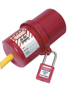 - Lockout device surrounds the electrical plug and protects against accidental reconnection
