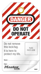 Master Lock #S4801 “Danger Do Not Operate” Customizable, Self-Laminating Photo Safety Tags.